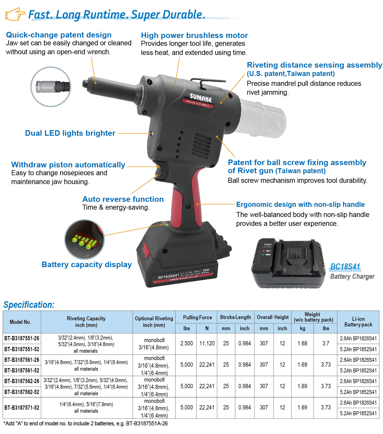 ●High performance 2.6A battery runtime: pulling 750 blind rivets-6.4mm.