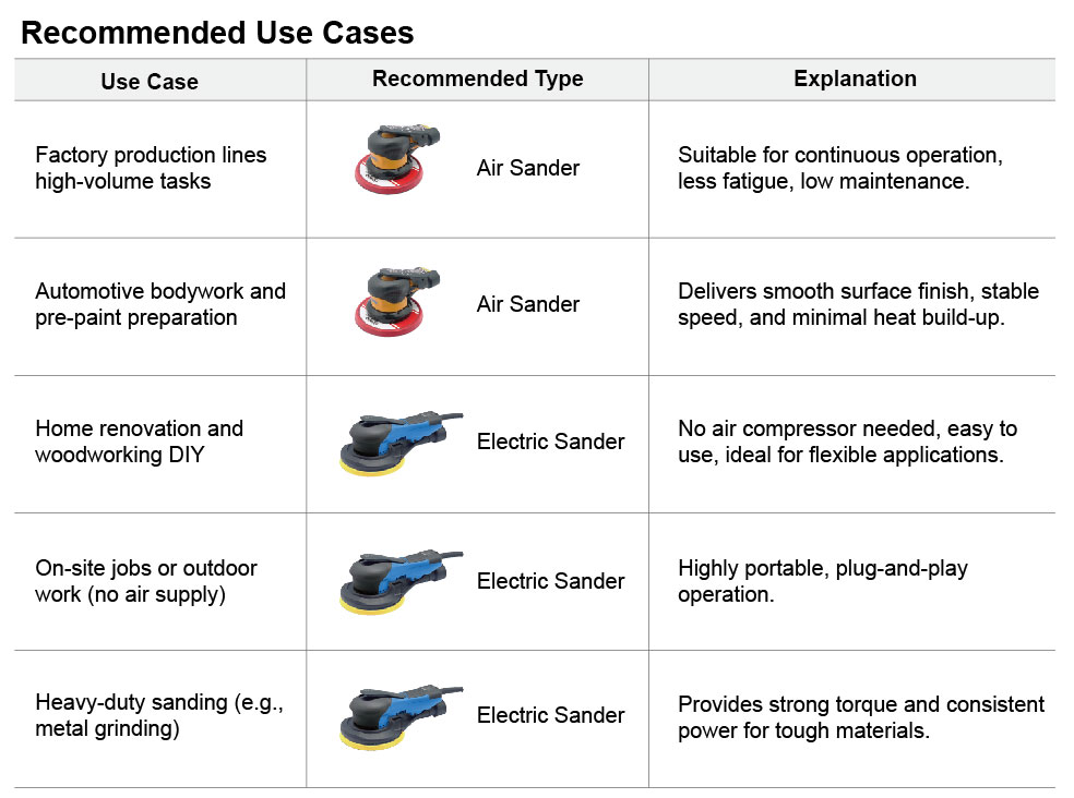 If you are looking for a high-efficiency, lightweight tool for long-duration tasks and already have an air system, an air sander is ideal. On the other hand, if you valueease of use and versatility across different locations, an electric sander is more practical.