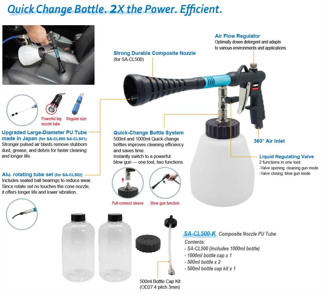 ●Flexible suction tube with unique bottle provide cleaning angle at 360°